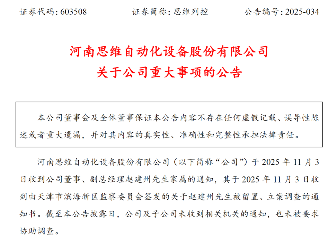 11月3日晚间,思维列控(603508)发布公告称,公司当日收到公司董事、副总经理赵建州家属的通知,其于11月3日收到由天津市滨海新区监察委员会签发的关于赵建州被留置、立案调查的通知书。
