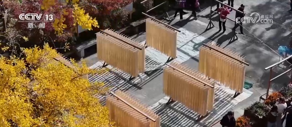 大家看,记者身后这棵1500岁的“银杏皇后”现在正是最美的时候。在这里,随手一拍都是大片。上周末,这里涌入游客超10万人次。当地的村民兴致勃勃的介绍道:“这就是八都岕的银杏面,现在这么多游客来了,这里必须打卡的一碗面。每年到白露的时候,我们都会在老百姓手上收银杏果,晒干再炒熟,再磨成粉,这样加工出来一款银杏面。我们这个面条晒在“银杏皇后”树下,晒6个小时以上,晒面的场景是相当壮观。”